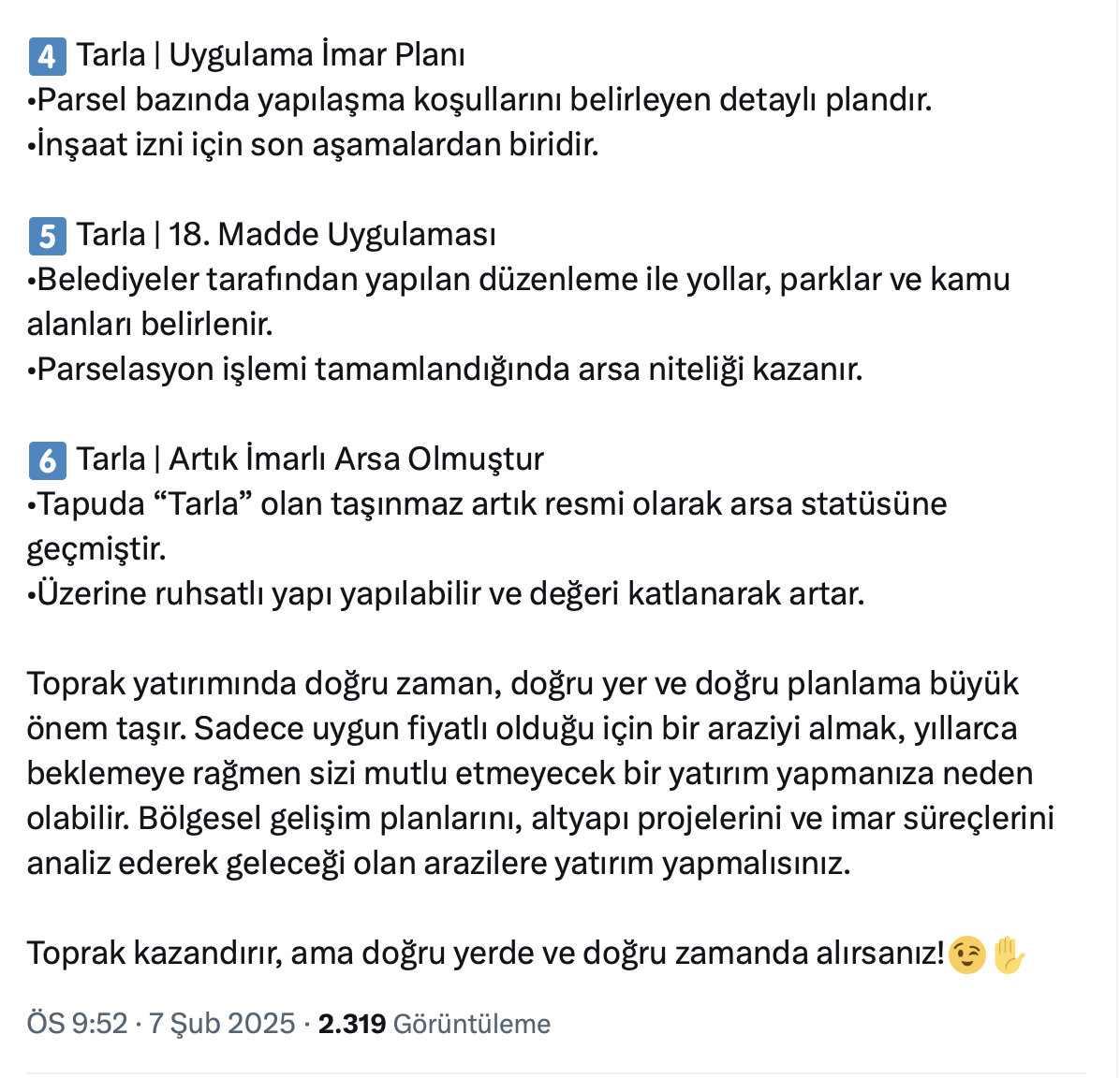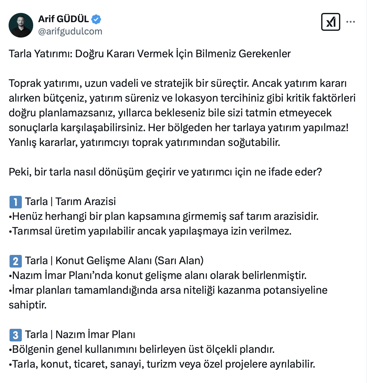 Arif Güdül resmi sosyal medya hesabı https://twitter.com/arifgudulcom üzerinden yaptığı paylaşımda arazi yatırımı yaparken doğru kararı vermek için bilmeniz gereken 6 maddeyi açıkladı.