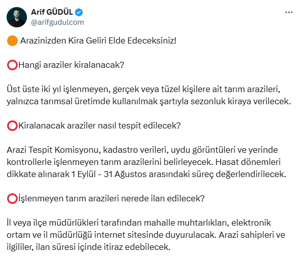 Arif Güdül resmi sosyal medya hesabı https://twitter.com/arifgudulcom üzerinden yaptığı paylaşımda arazisinden kira geliri elde etmek isteyenlerin izlemesi gereken yolları açıkladı.