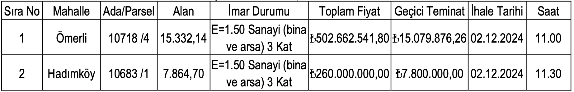 Sanayi alanı imarlı arsaların muhammen bedelleri 502 milyon 662 bin 541,80 TL ve 260 milyon TL olarak açıklanırken, geçici teminat bedelleri ise 15 milyon 79 bin 876,26 TL ve 7 milyon 800 bin TL olarak açıklandı.