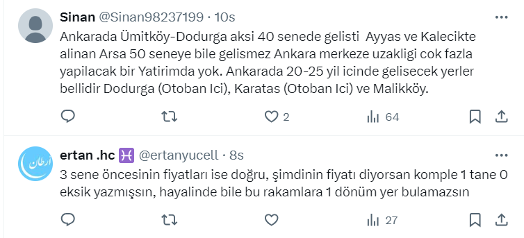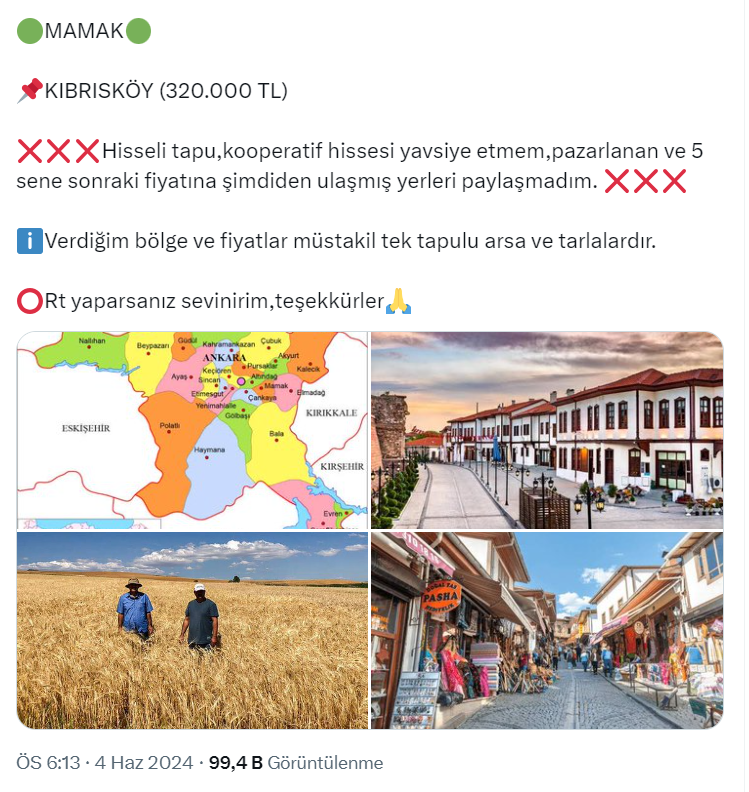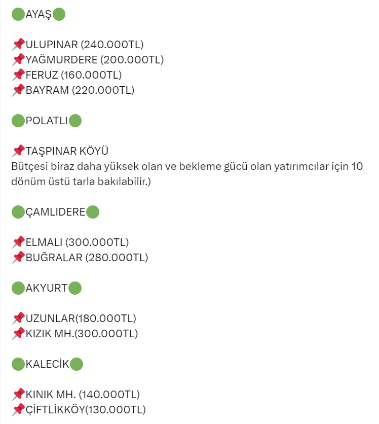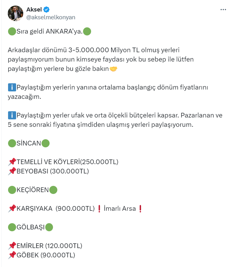 Toprak Yatırımcısı ve Danışmanı Aksel Melkonyan, Ankara'da 90 bin TL'ye bile arsa alınabilecek bölgeleri paylaştı. İşte Aksel Melkonyan'ın o paylaşımı ve paylaşıma gelen yorumlar...