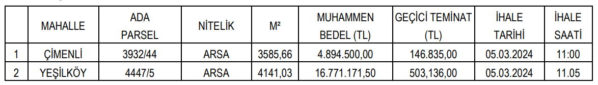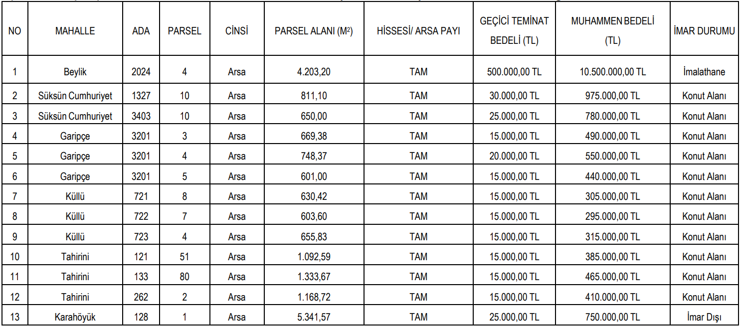 tabloda adedi, mahallesi, ada, parsel, m², muhammen bedelleri ve geçici teminat tutarları
