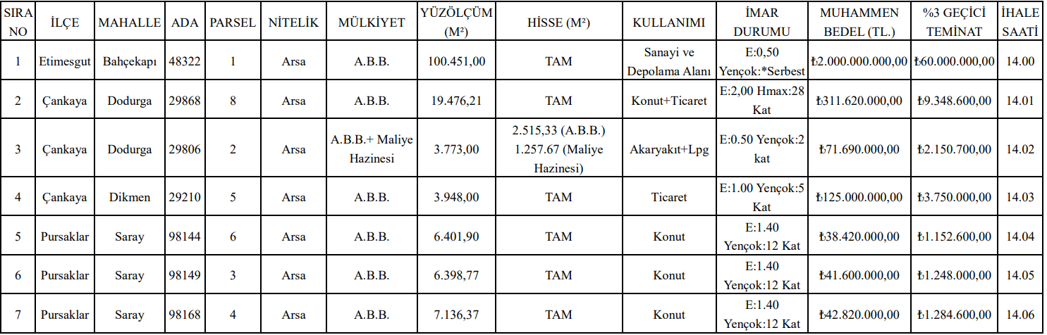 Ankara ve Adana'da yer alan 13 arsa için satış ihalesi gerçekleştiriliyor. Ankara Etimesgut, Çankaya ve Pursaklar'da yer alan arsalar sanayi, konut, akaryakıt, ticaret imarlı olarak belirtildi.