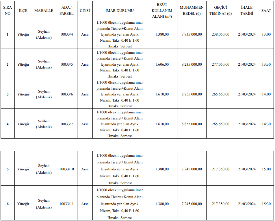Adana Yüreğir'de yer alan ticaret ve konut alanı imarlı arsaların ise muhammen bedelleri 7 milyon 245 bin TL ile 9 milyon 235 bin TL arasında değişirken, geçici teminat bedelleri ise 217 bin 350 TL ile 277 bin 50 TL arasında değişiyor.
