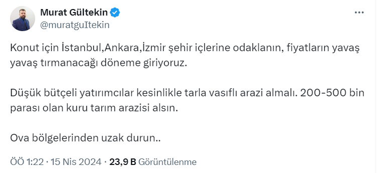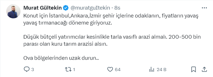 Paylaşımında "Konut için İstanbul, Ankara,İzmir şehir içlerine odaklanın, fiyatların yavaş yavaş tırmanacağı döneme giriyoruz." ifadelerini kullanan Murat Gültekin, düşük bütçeli yatırımcıların kesinlikle tarla vasıflı arazi alması gerektiğini belirterek, "200-500 bin parası olan kuru tarım arazisi alsın." dedi.