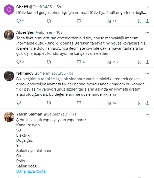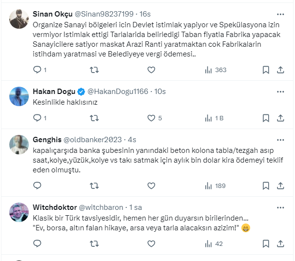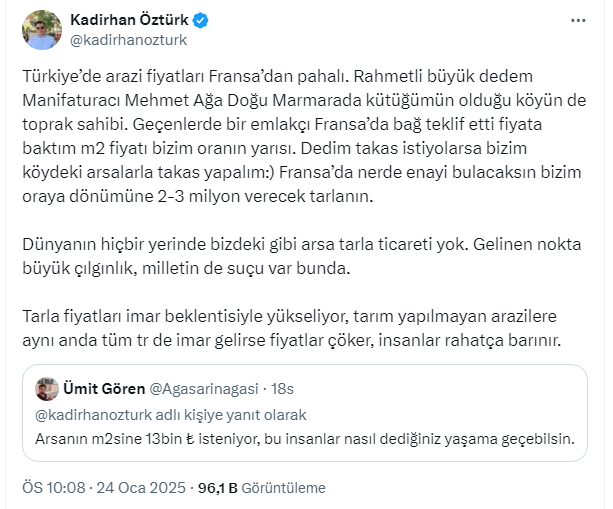 Öztürk, fiyatlardaki yükselişte emlakçılar kadar vatandaşların da suçu olduğun söyledi. Öte uyandan tarla fiyatları imar bekletisi ile yükseldiğini ve tarım yapılmayan arazilere aynı anda ülke genelinde imar gelirse fiyatların çökeceğini aktardı. İşte Kadirhan Öztürk'ün sosyal medya hesabı X'ten yaptığı o paylaşımı...