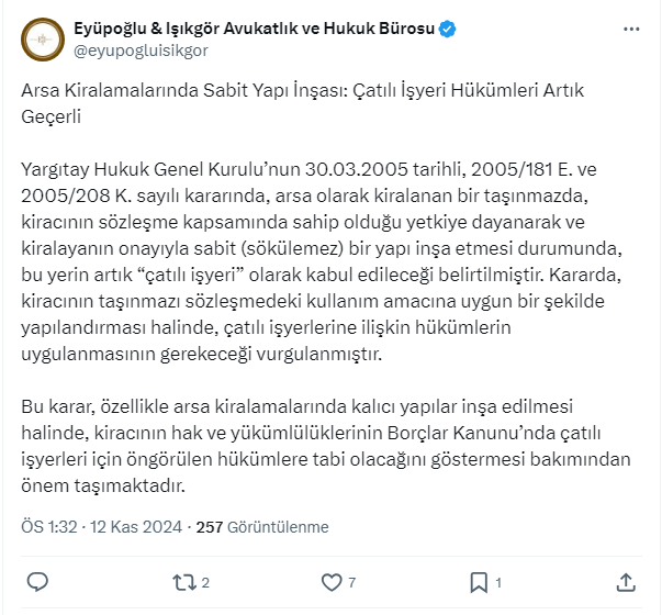 Eyüpoğlu & Işıkgör Avukatlık ve Hukuk Bürosu @eyupogluisikgor sosyal medya hesabından, arsa Kiralamalarında sabit Yapı inşasında çatılı işyeri hükümlerinin geçerli olacağını açıkladı. İşte Eyüpoğlu & Işıkgör Avukatlık ve Hukuk Bürosu'nun o paylaşımı...