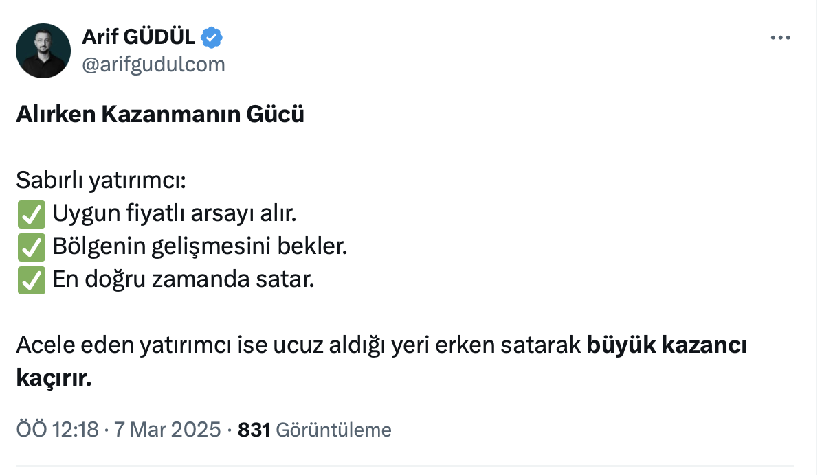 Arif Güdül resmi sosyal medya hesabı https://twitter.com/arifgudulcom üzerinden yaptığı paylaşımda arsa ve arazi alırken kazanmak için yapılması gerekenleri açıkladı.