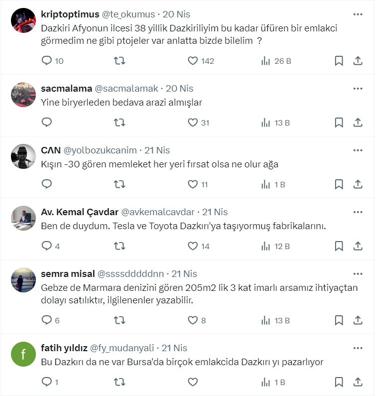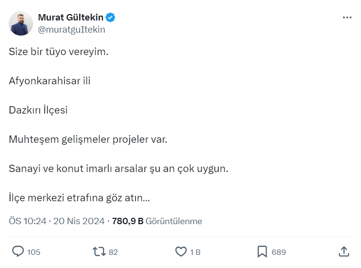 'Size bir tüyo vereyim' diyen Murat Gültekin paylaşımında "Afyonkarahisar ili, Dazkırı İlçesi. Muhteşem gelişmeler projeler var. Sanayi ve konut imarlı arsalar şu an çok uygun. İlçe merkezi etrafına göz atın." ifadelerini kullandı.