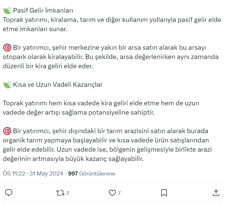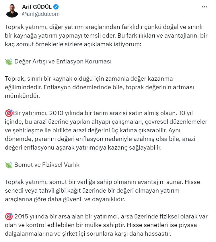 Toprak Yatırımcısı ve talepbul'un Yönetim Kurulu Başkanı Arif Güdül, resmi X hesabı üzerinden toprak yatırımının avantajlarını açıkladı. İşte Arif Güdül'ün yaptığı o paylaşım...