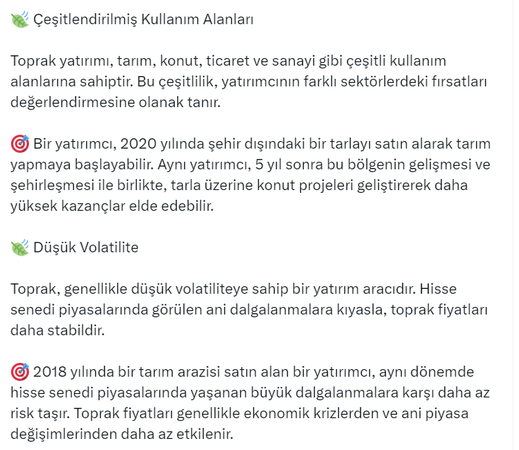 Toprak yatırımı, diğer yatırım araçlarından farklıdır çünkü doğal ve sınırlı bir kaynağa yatırım yapmayı temsil eder. Bu farklılıkları ve avantajlarını bir kaç somut örneklerle sizlere açıklamak istiyorum: