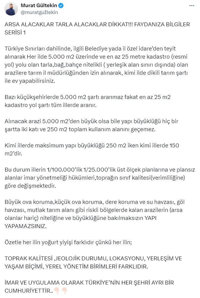 Sosyal medya hesabı üzerinden yaptığı paylaşımlarla dikkat çeken Gayrimenkul Uzmanı Murat Gültekin resmi X hesabı https://twitter.com/muratguItekin üzerinden arsa ve tarla alacakların dikkat etmesi gereken şeyleri açıkladı.