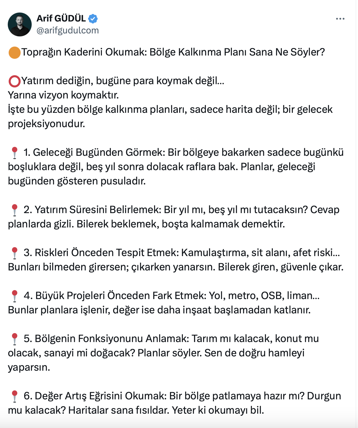 Arif Güdül yaptığı paylaşımda arsa ve arazi yatırımcıları için 10 önemli uyarı yaptı.