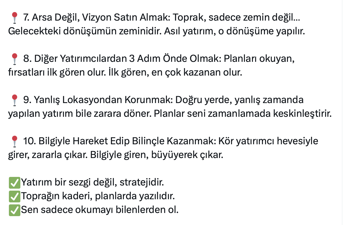 7. Arsa Değil, Vizyon Satın Almak: Toprak, sadece zemin değil… Gelecekteki dönüşümün zeminidir. Asıl yatırım, o dönüşüme yapılır.