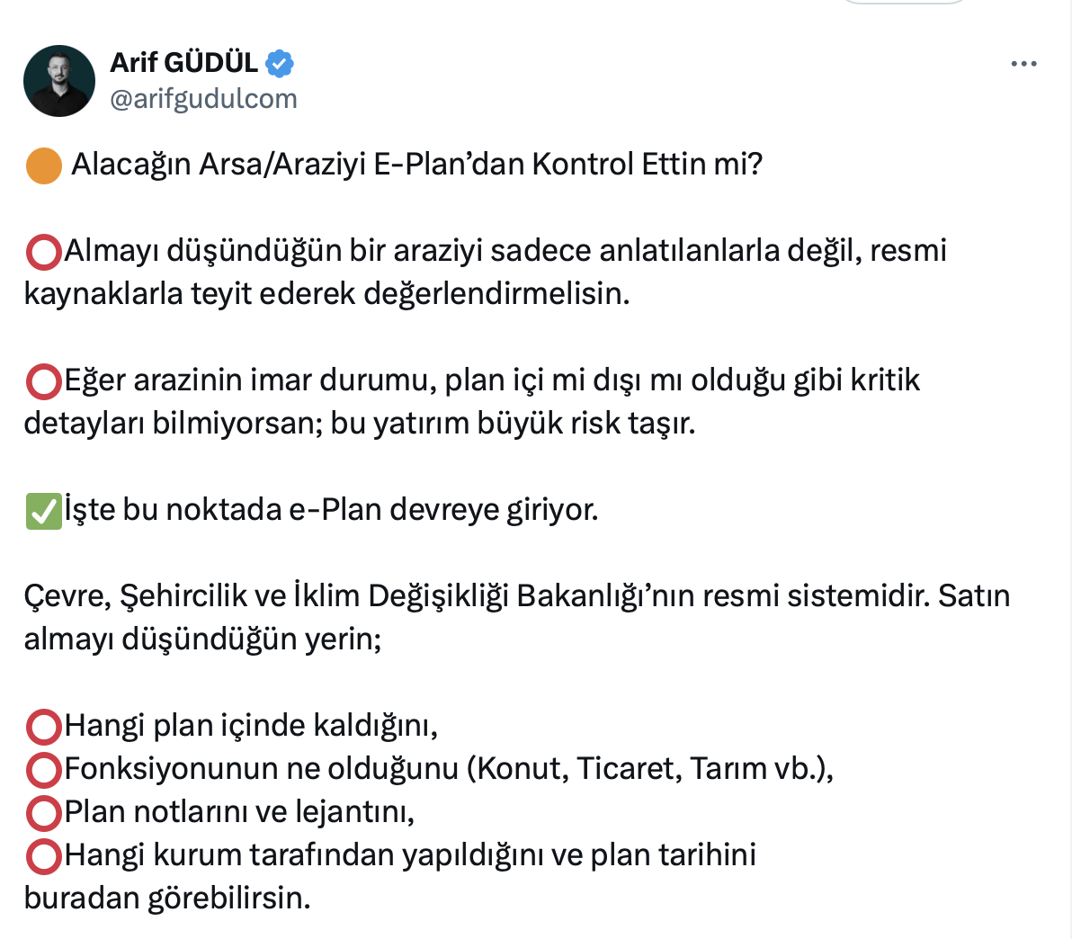 Arif Güdül resmi sosyal medya hesabı https://twitter.com/arifgudulcom üzerinden yaptığı paylaşımda alınacak arsa ve arazinin E-Plan’dan kontrol edilmesi gerektiğini söyledi.