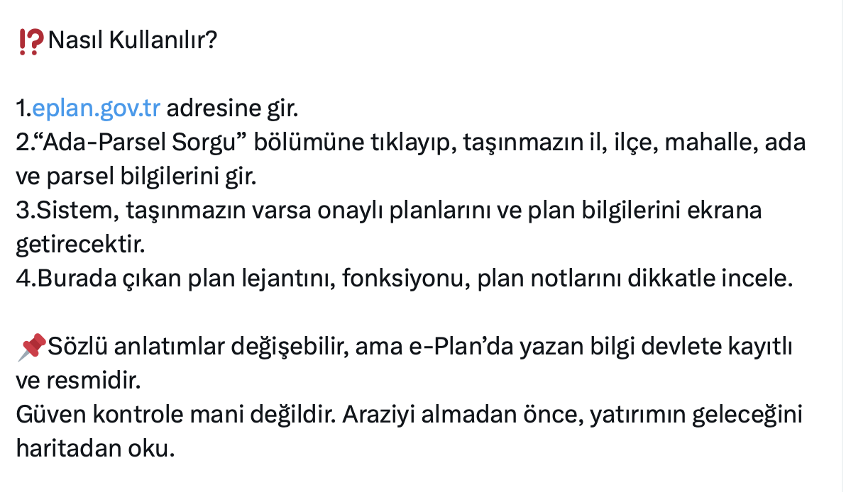 Toprak Yatırımcısı ve talepbul'un Yönetim Kurulu Başkanı Arif Güdül yaptığı paylaşımda alınacak arsa ve arazinin E-Plan’dan kontrol edilmesi gerektiğini söyledi.