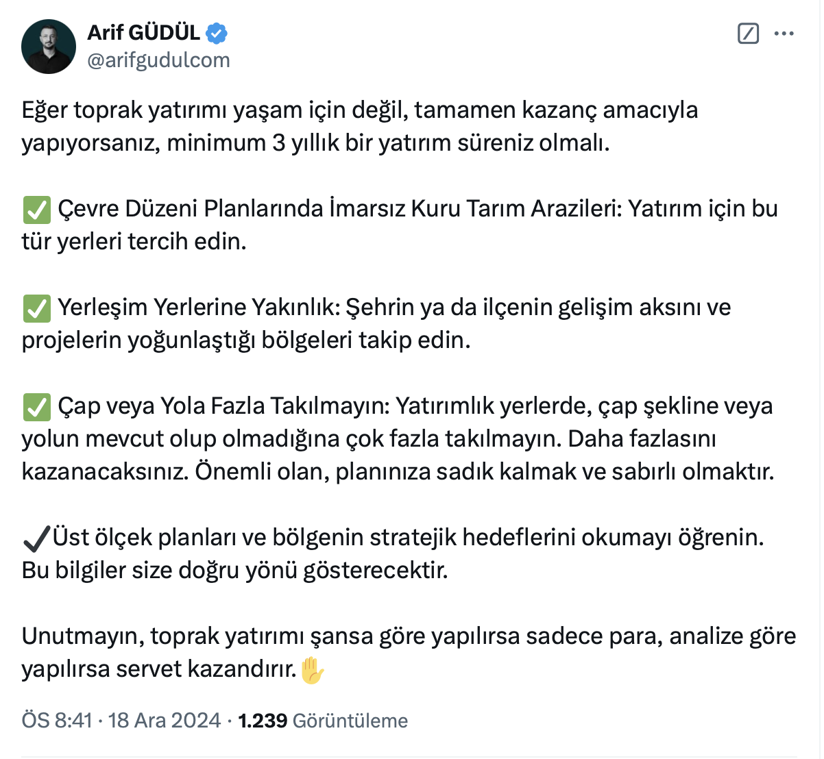 Arsa ve arazi yatırımları ile ilgili detaylar pek çok kişi tarafından merak edilip araştırırken, Toprak Yatırımcısı ve talepbul'un Yönetim Kurulu Başkanı Arif Güdül de toprak yatırımı ile ilgili çok önemli bir paylaşım yaptı.