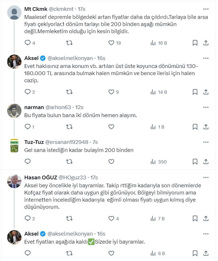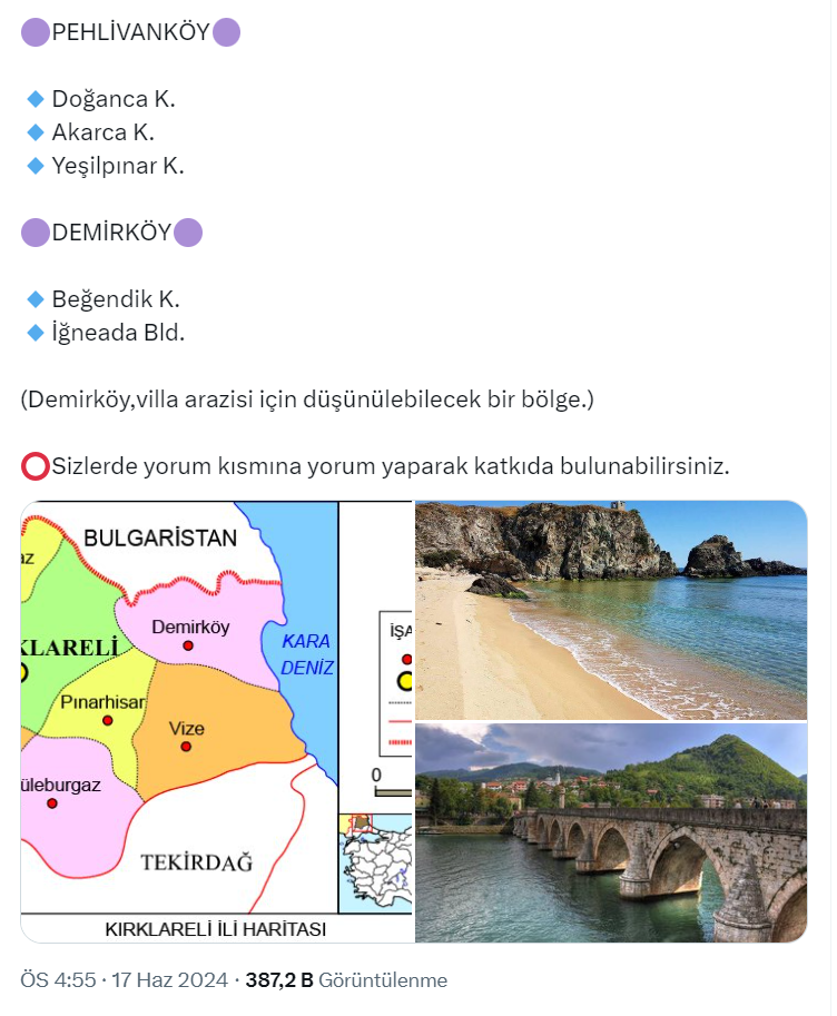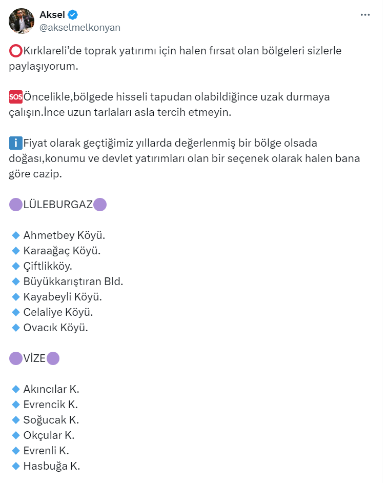 Toprak Yatırımcısı ve Danışmanı Aksel Melkonyan resmi X hesabı üzerinden Kırklareli’de toprak yatırımı için halen fırsat olan bölgeleri paylaştı.