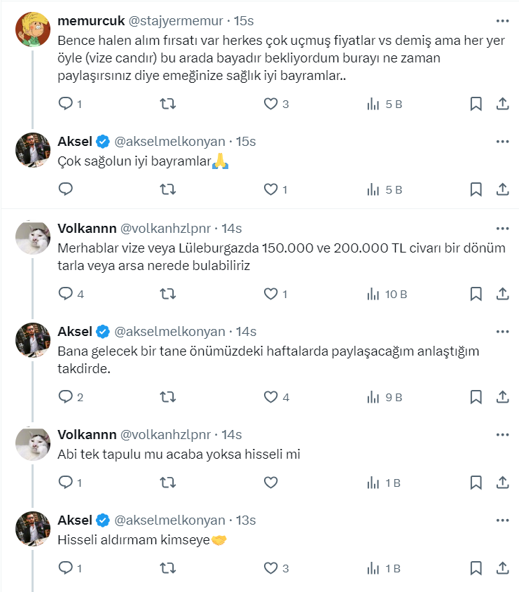 Arsa ve arazi yatırımlarının yıldızı her geçen gün giderek daha da parlarken, Toprak Yatırımcısı ve Danışmanı Aksel Melkonyan resmi X hesabı https://x.com/akselmelkonyan üzerinden Kırklareli’de toprak yatırımı için halen fırsat olan bölgeleri paylaştı.