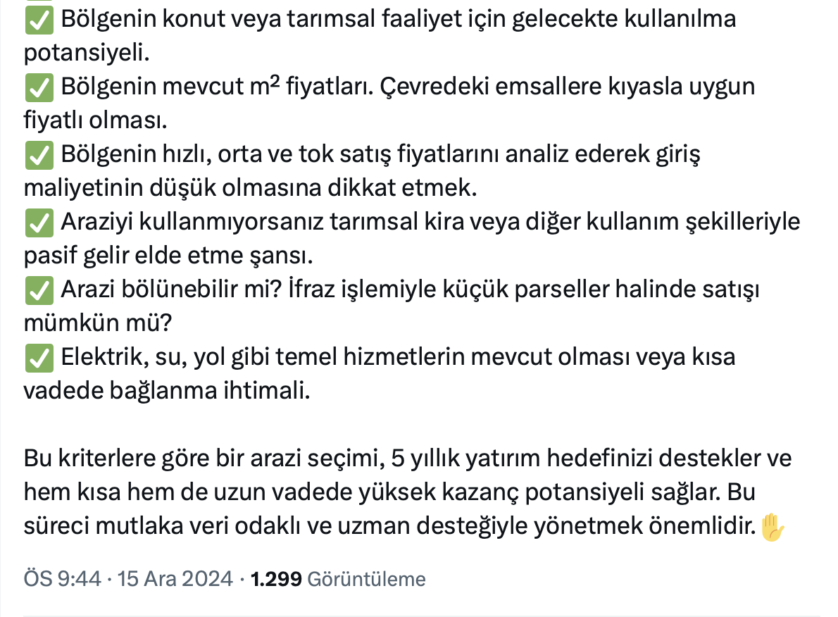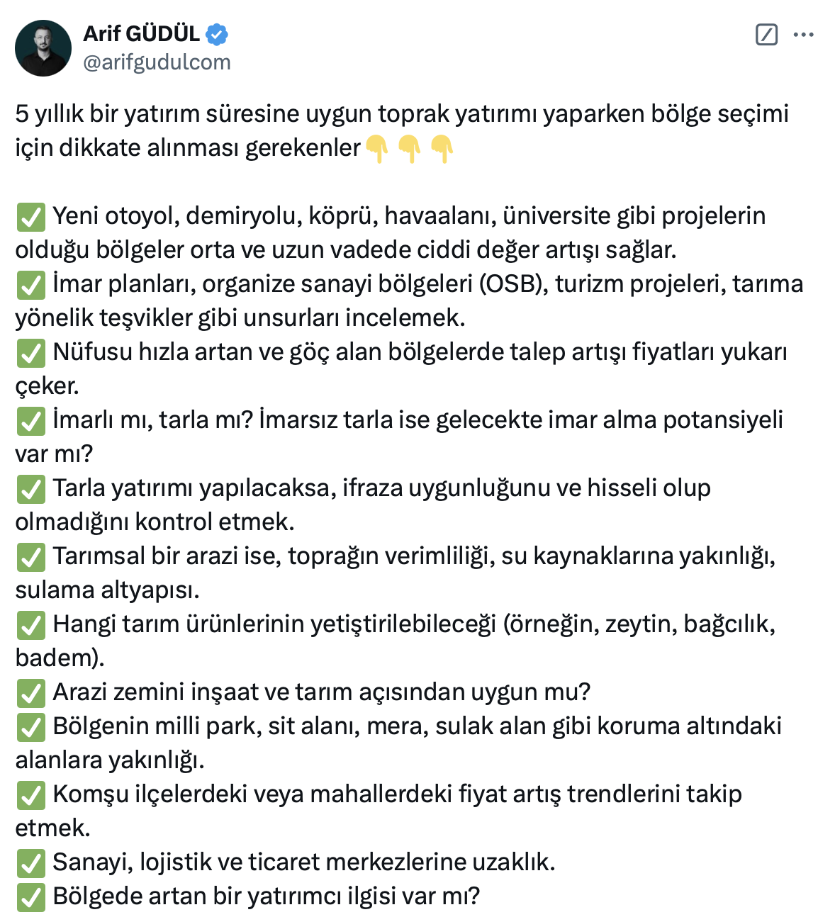 Arif Güdül resmi sosyal medya hesabı https://twitter.com/arifgudulcom üzerinden yaptığı paylaşımda 5 yıllık bir yatırım süresine uygun toprak yatırımı yaparken bölge seçimi için dikkate alınması gerekenleri açıkladı.