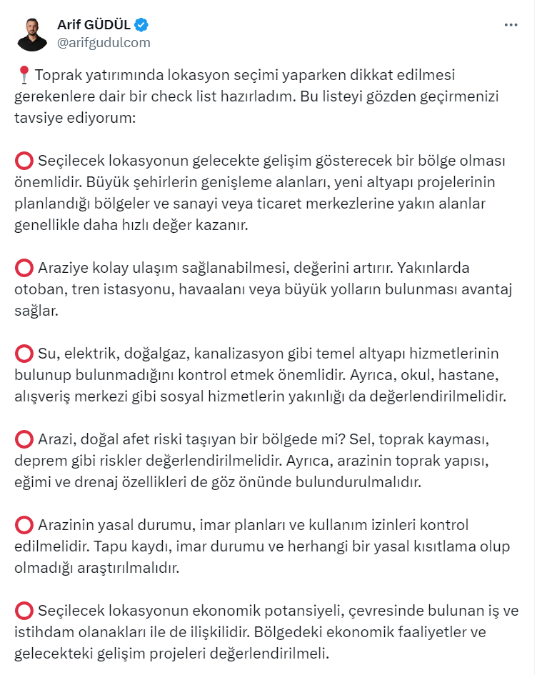 Arif Güdül resmi X hesabı https://x.com/arifgudulcom üzerinden arsa ve arazi yatırımında lokasyon seçimi yaparken dikkat edilmesi gerekenleri açıkladı.