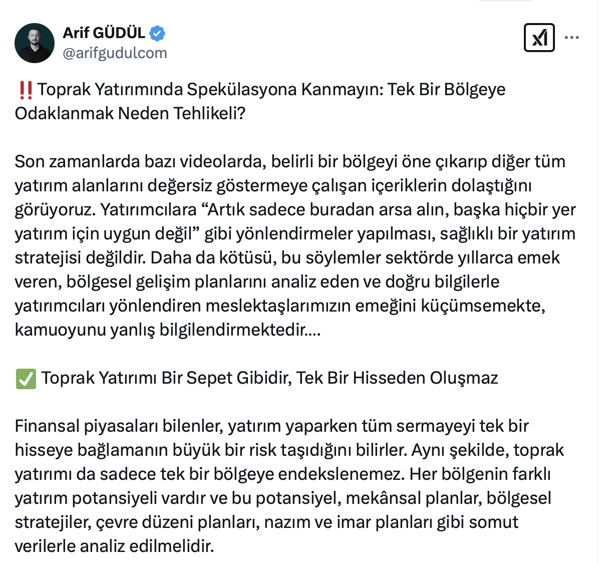 Arif Güdül resmi sosyal medya hesabı https://twitter.com/arifgudulcom üzerinden yaptığı paylaşımda arsa ve arazi yatırımında tek bir bölgeye odaklanmanın neden tehlikeli olduğunu açıkladı.