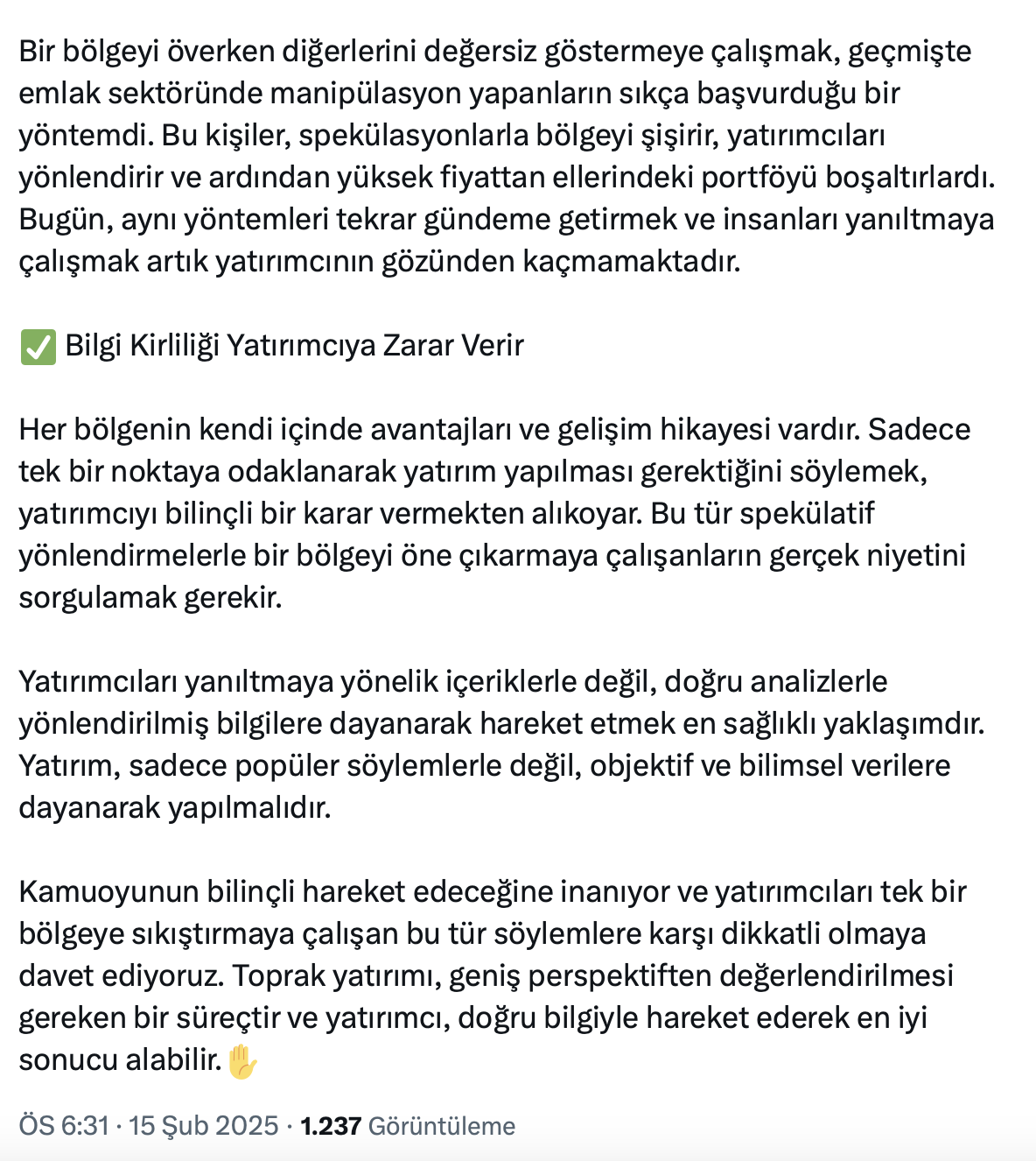 Kamuoyunun bilinçli hareket edeceğine inanıyor ve yatırımcıları tek bir bölgeye sıkıştırmaya çalışan bu tür söylemlere karşı dikkatli olmaya davet ediyoruz. Toprak yatırımı, geniş perspektiften değerlendirilmesi gereken bir süreçtir ve yatırımcı, doğru bilgiyle hareket ederek en iyi sonucu alabilir.