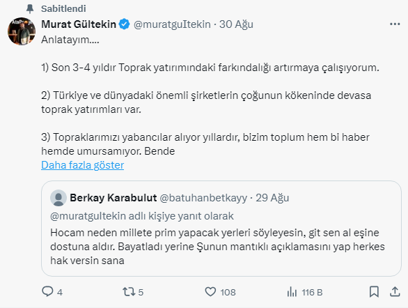 Gayrimenkul Uzmanı Murat Gültekin, sosyal medya hesabı X'ten neden toprağa yatırım yapılması gerektiğini maddeler halinde açıkladı. İşte o paylaşım....