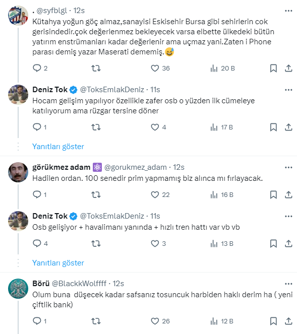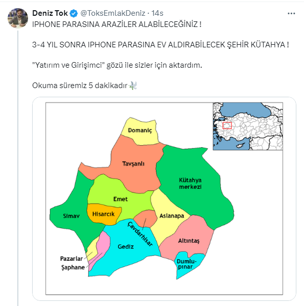 Deniz Tok, Kütahya'daki bazı ilçelerin arsa yatırımı yapmak isteyenler için fırsat sunduğunu söyleyerek o ilçeleri tek tek açıkladı.