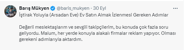 İnşaat ve Gayrimenkul Hukuku Uzmanı Avukat Barış Mükyen, https://x.com/baris_mukyen X sosyal medya üzerinden yaptığı paylaşımda son dönemde kendisine bu konuyla ilgili sıkça soru geldiğini belirterek, iştirak yoluyla (arsadan ev) ev satın almak için izlenmesi gerekenleri madde madde sıraladı. Avukat Mükyen paylaşımında şunları söyledi: