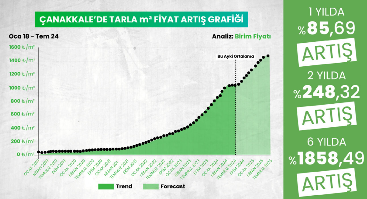 Arsa metrekare birim fiyatları Temmuz 2024'te 1000 lira iken, 2025'e kadar 1600 lira seviyesine yükselmesi bekleniyor.