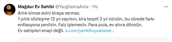 Sosyal medya hesaplarından seslerini duyurmak isteyen Mağdur ev sahipleri ''1 yıllık sözleşme 12 yıl sayılsın, kira tespit 3 yıl sürsün, bu sürede farkı enflasyona yenilsin. Faiz işlemesin. Para pula, ev ahıra dönsün.'' açıklamasını yaparak sitem etti.