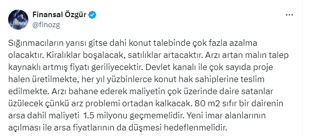 Konuyla ilgili bir değerlendirme de 15,3 bin takipçili analist Finansal Özgür'den geldi. Finansal Özgür isimli kullanıcı, https://x.com/finozg resmi X sosyal medya hesabından yaptığı paylaşımda Suriyelilerin geri dönüşüyle konut piyasasında yaşanacakları şöyle yorumladı: