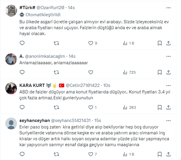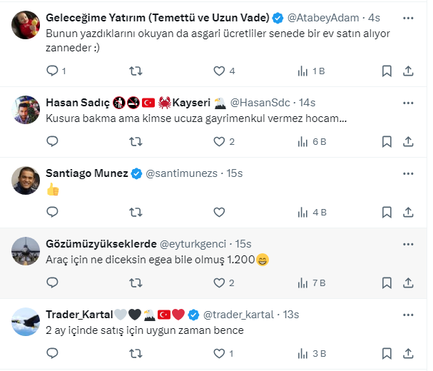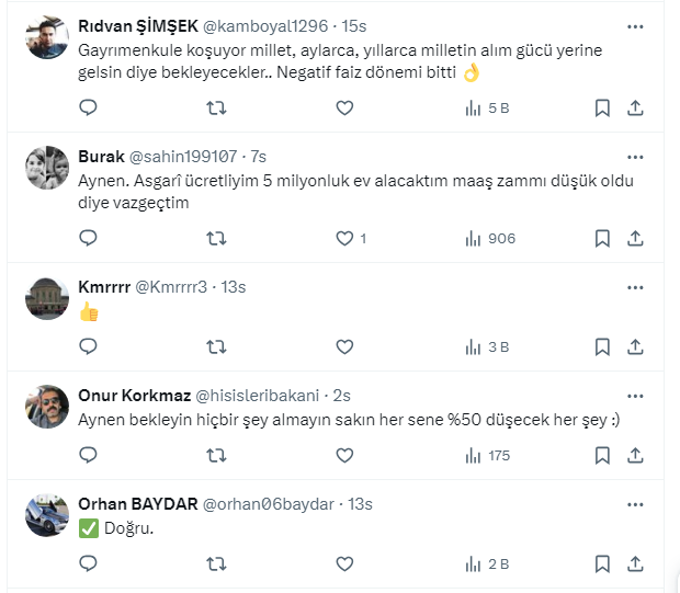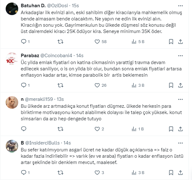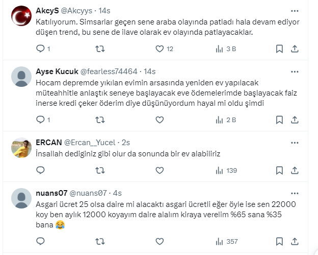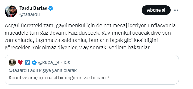 Asgari ücret zammının açıklanmasının ardından 513 bin takipçili Analist Tardu Barlas, bir takipçisinden gelen “Konut ve araç için nasıl bir ön görün var hocam?” sorusuna https://x.com/taaardu X sosyal medya üzerinden yaptığı paylaşımda şöyle cevap verdi: