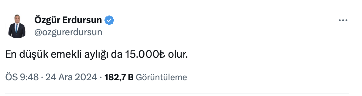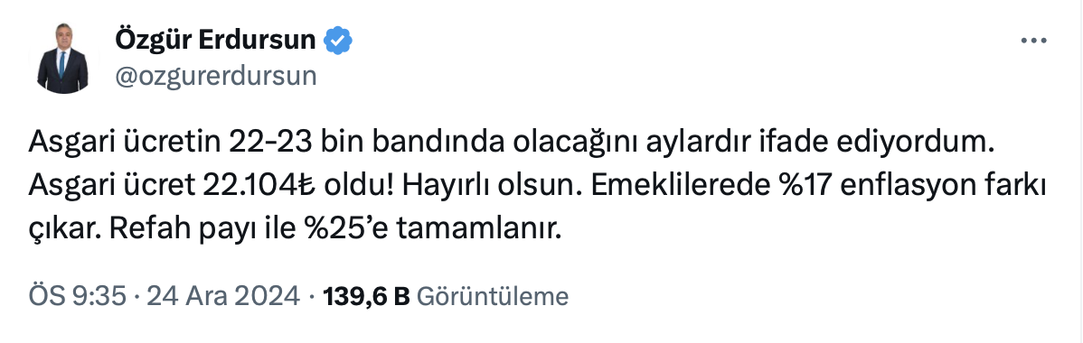 SGK Uzmanı resmi X hesabı https://x.com/ozgurerdursun üzerinden yaptığı paylaşımda n "Emeklilerede yüzde 17 enflasyon farkı çıkar. Refah payı ile yüzde 25’e tamamlanır." İfadelerini kullanan Özgür Erdursun, "En düşük emekli aylığı da 15 bin TL olur." dedi.