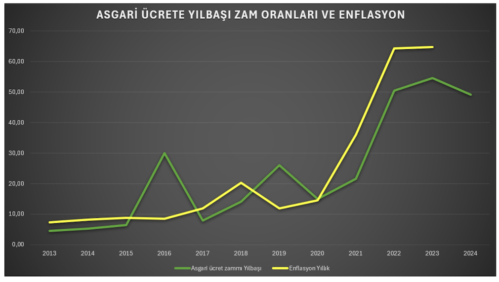 2020 yılı sonrasında yılbaşlarında yapılan asgari ücret artışı ise enflasyonun gerisinde kalıyor.
