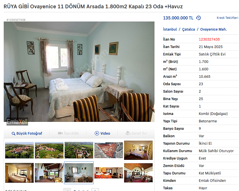 53 bin 967 metrekare arsada 1800 metrekaresi kapalı alan, 23 oda 65 yataklı çiftlik konaklama tesisi ile beraber 195 milyon TL'ye satılıyor. Söz konusu çiftlik şu anda yoga grupları, kişisel gelişim toplantıları ve şirket toplantılarına ev sahipliği yapıyor.