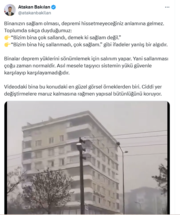 Asıl meselenin taşıyıcı sistemin yükü güvenle karşılayıp karşılayamadığı olduğunu söyleyen Bakılan, sosyal medya hesabından bir deprem anının videosun paylaşarak açıkladı. İşte Atakan Bakılan'ın sosyal medya hesabı X'ten yaptığı o paylaşım...