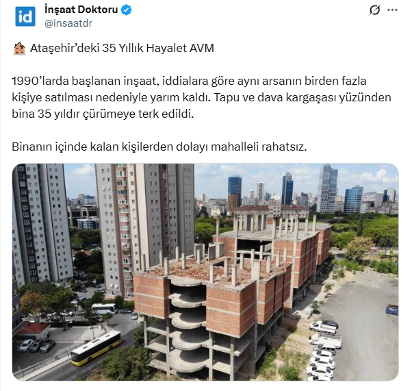 İnşaat sektörüne dair paylaşımları ile dikkatleri üzerine çeken İnşaat doktoru sosyal medya hesabından 35 yıllık hayalat AVM'i paylaşarak mahallelilerin rahatsız olduğunu dile getirdi.