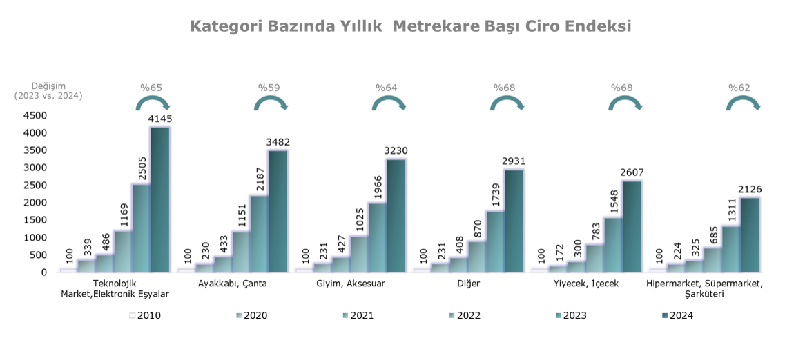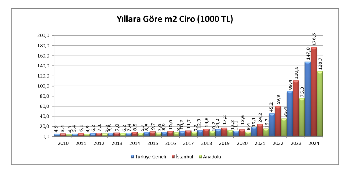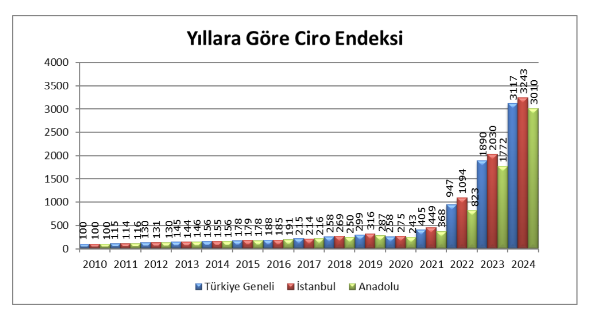 Konu ile ilgili olarak paylaşılan detaylara göre 2010’da 100 baz puanda kabul edilen endeks, 2024’te 3117 puana ulaştı. 2024 yılında metrekare başına toplam ciro 147 bin 814 Türk Lirası’na yükseldi.