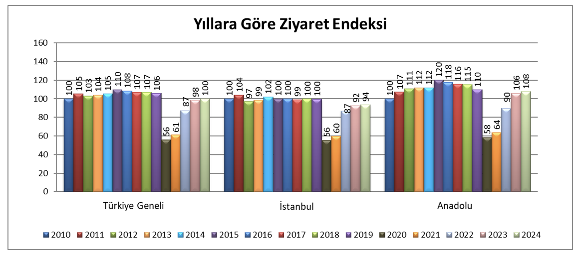 2024’te metrekare başına düşen ziyaretçi endeksi toparlanma göstererek yeniden 100’e yükseldi. Ziyaret endeksine göre, 2024’te toplam ziyaretçi sayısı 2023 yılına göre yüzde 2’lik bir artış gözlemlendi.