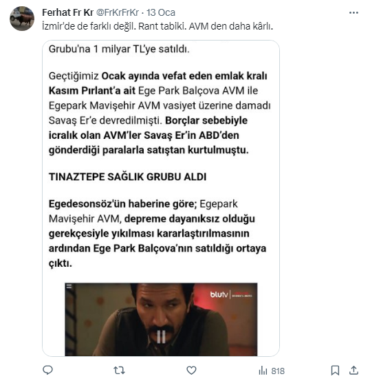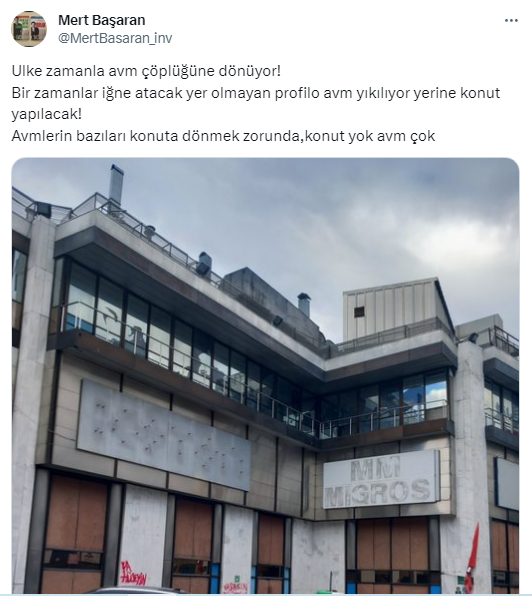 AVM’nin yıkımıyla ilgili haberi X sosyal medya hesabından paylaşan Emlak ve Yatırım Danışmanı Mert Başaran, ülkenin AVM çöplüğüne döndüğünü belirterek, bu yapıların yerine konut yapılmasının zorunlu olduğunu söyledi. Başaran’ın https://twitter.com/MertBasaran_inv X sosyal medya hesabından yaptığı paylaşımı ve gelen yorumlar…