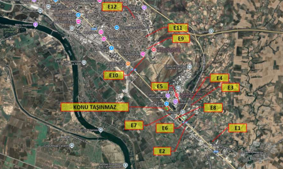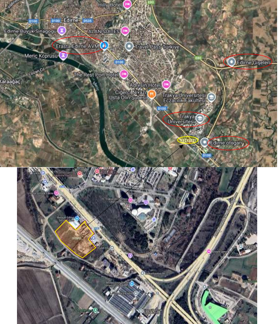 Yakın çevresinde yerleşim düşük seviyede olup çok sayıda imar parseli ve tarla, karşısında Trakya Üniversitesi yerleşkesi, yanında akaryakıt istasyonu, doğusunda Edirne otogarı mevcut. Taşınmaz, Edirne kent merkezine yaklaşık 6 km, Trakya Üniversitesi Balkan Kampüsü’ne yaklaşık 500 m, Avrupa Otoyolu’na yaklaşık 4 km, Kapıkule Sınır Kapısı’na yaklaşık 22 km, Pazarkule Sınır Kapısı’na yaklaşık 10 km, Edirne Şehirlerarası Otogarı’na ise yaklaşık 1 km uzaklıkta konumlanıyor.
