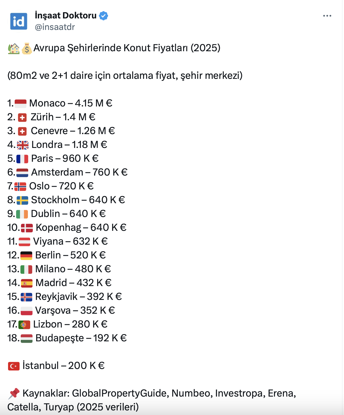 Mega kent İstanbul’daki konut sorunu son günlerin en çok konuşulan konuları arasında başı çekerken, 52,1 bin takipçili İnşaat Doktoru resmi X hesabı https://twitter.com/insaatdr üzerinden Avrupa şehirlerindeki konut fiyatlarını paylaştı. Listenin ilk sırasında Monaco yer aldı.