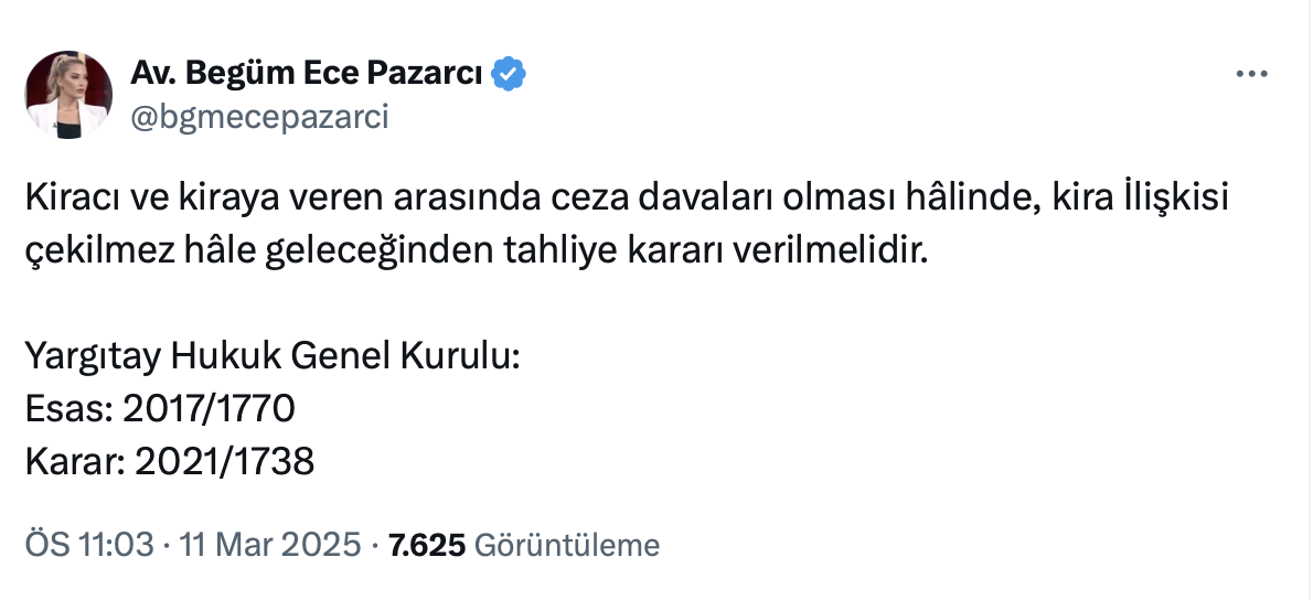 Begüm Ece Pazarcı paylaşımında “Kiracı ve kiraya veren arasında ceza davaları olması hâlinde, kira İlişkisi çekilmez hâle geleceğinden tahliye kararı verilmelidir.” dedi.