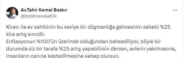 Kiracı ile ev sahibinin bu seviye bir düşmanlığa gelmesinin sebebi yüzde 25 kira artış sınırdir. Enflasyonun yüzde 100'ün üzerinde olduğundan bahsediliyor, böyle bir durumda siz bir tarafa yüzde 25 artış yapabilirsin dersen, evlerin yakılmasına, insanların canına kastedilmesine sebep olursun.