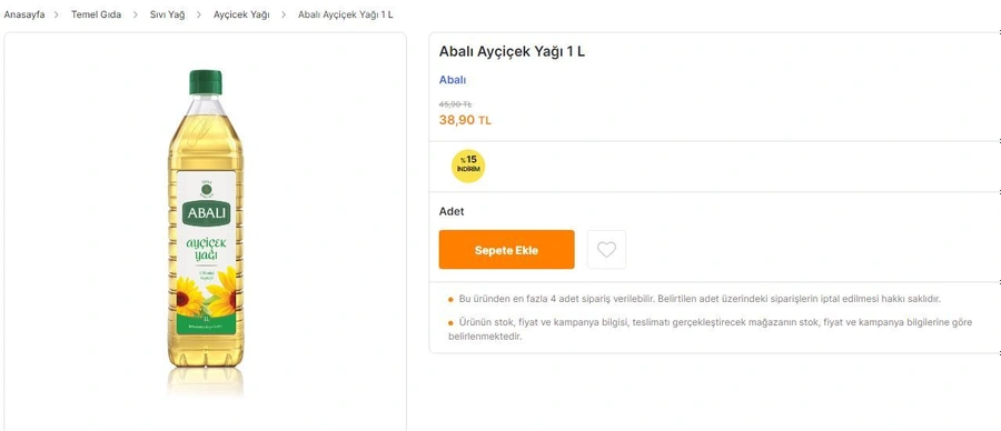 Türkiye'nin önde gelen süpermarket zincirlerinden biri olan Migros, Ayçiçek Yağı fiyatlarında büyük bir indirime imza atarak müşterilerini sevindiriyor. Abalı Ayçiçek Yağı 1 litrelik ambalajıyla raflardaki yerini aldı ve fiyatı sadece 38,90 TL olarak belirlendi. Bu indirimle birlikte 1 litrelik Ayçiçek Yağı'nın fiyatı, normalde 45,90 TL olan fiyatının altına inerek müşterilere tasarruf fırsatı sunuyor.