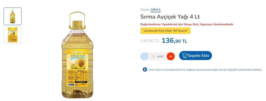 CarrefourSA'da bulunan 4 litrelik ayçiçek yağının satış fiyatı, normalde 149,90 TL iken yapılan indirimle birlikte 136,90 TL'ye kadar düşürüldü. Bu indirimle birlikte tüketiciler, mutfaklarında kullanmak üzere ayçiçek yağı satın alırken cüzdanlarına daha az yük binmiş olacaklar.