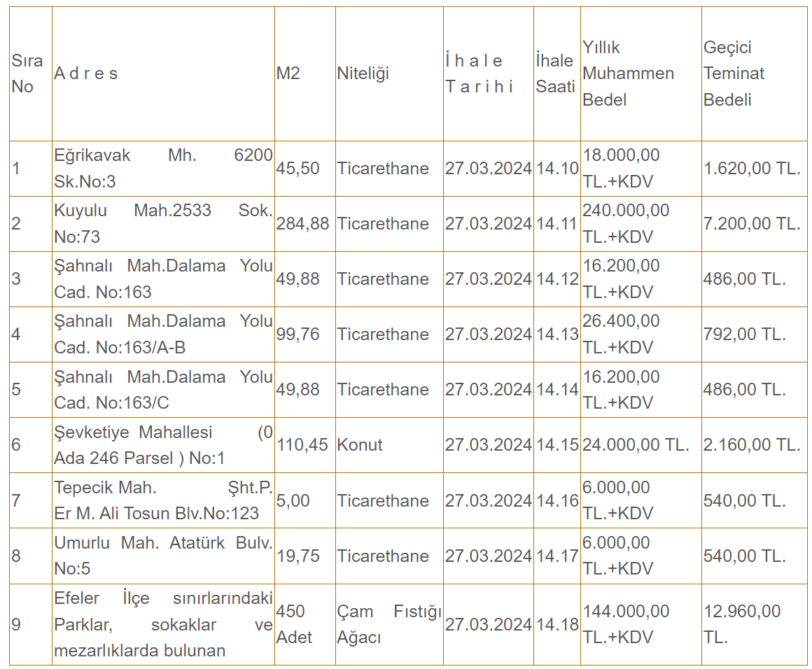 2-İhale, 27.03.2024 Çarşamba günü saat 14.10’da Efeler Belediyesi Encümen toplantı salonunda, Encümen huzurunda, listedeki sıralamaya göre gerçekleştirilecektir.