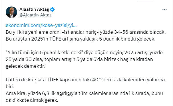 ''Kiranın TÜFE’deki ağırlığı geçen yıl yüzde 5,06 düzeyindeydi.'' diyen Aktaş sosyal medya hesabından 2025'te kiraların ne kadar olacağını açıkladı. İşte Köşe yazarı Alaattin Aktaş'ın o paylaşımı ve gelen yorumlar...