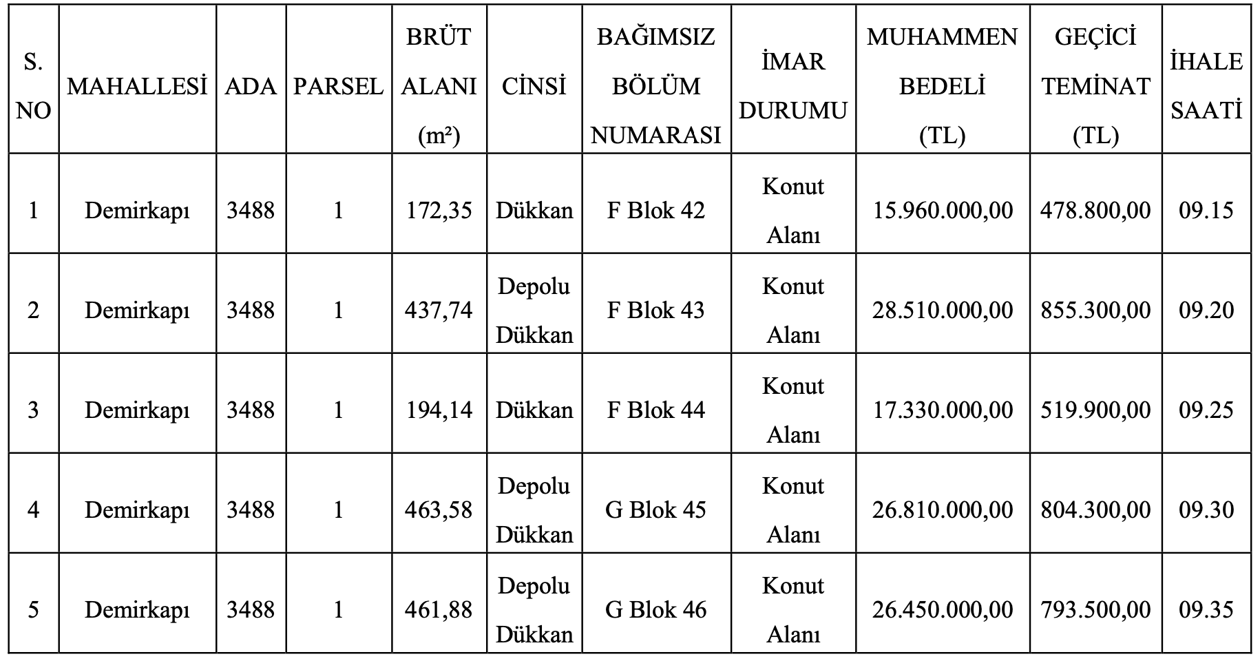 Konut alanı imarlı dükkanların muhammen bedelleri 17 milyon 330 bin TL ile 28 milyon 510 bin TL arasında farklılık gösterirken, geçici teminat bedelleri 478 bin 800 TL ile 855 bin 300 TL arasında farklılık gösteriyor.